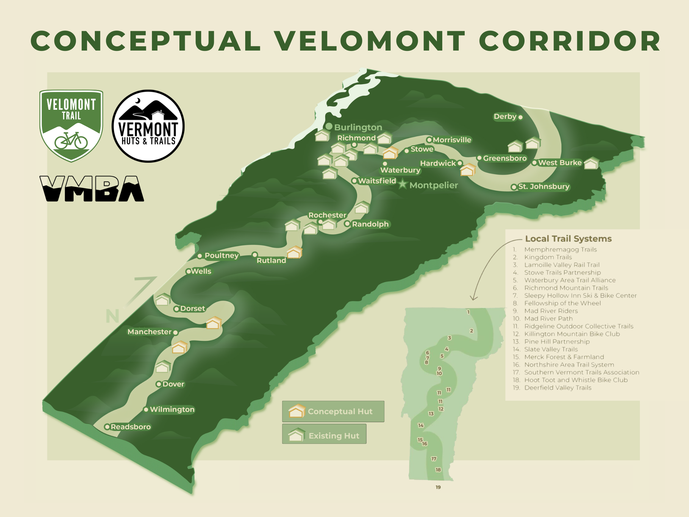 The Heart of the Greens Loop is the first completed multi-day segment of the Velomont Trail, a collaborative project of several Vermont organizations with the goal of connecting a series of single track trails and backcountry huts along the entire length of Vermont.